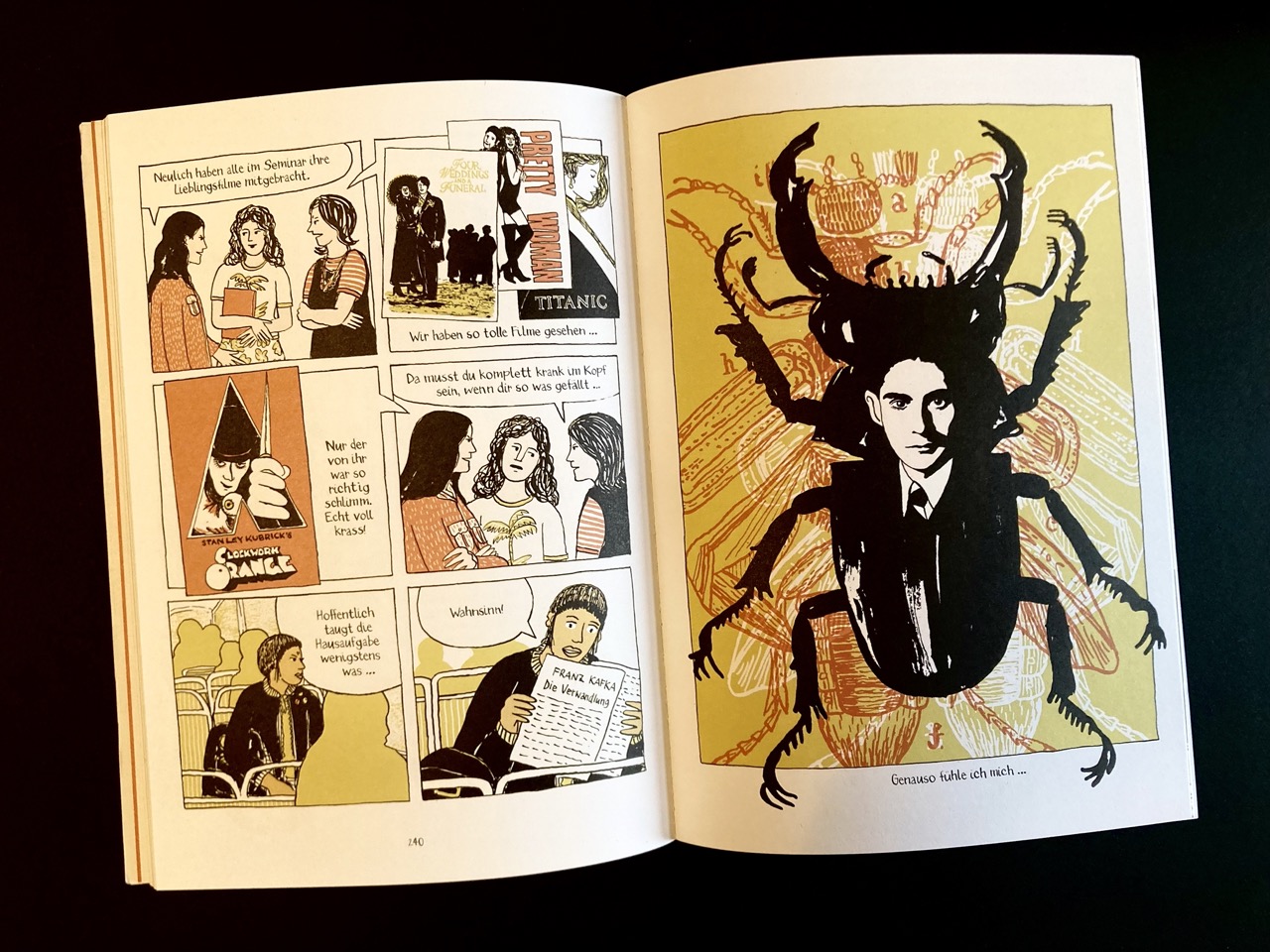 Crystal, also eigentlich Priscilla, macht ständig die Erfahrung, nicht dazuzugehören. Ich habe das Orange und das Grün gewählt, weil es unbequeme Farben sind. Das merkwürdige Grün ist eine Outsiderfarbe… Wie Rotz, etwas Unbequemes. Und Orange wird oft als Warnfarbe verwendet. Mein Vorgehen war ja so, das ich immer ein Kapitel gezeichnet und es Priscilla geschickt habe. Sie hat mir dann gespiegelt, was ich aus meiner weißen Sicht geschrieben habe, das eigentlich anders sein müsste. Deswegen sind diese Seite immer orange als Korrektur- und Warnfarbe.